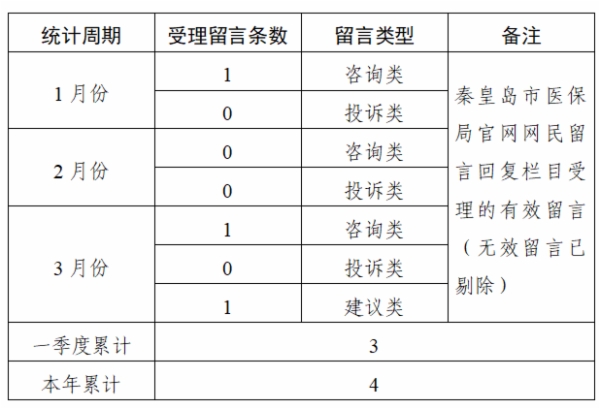 秦皇岛市医疗保障局 2026年第1季度 网民留言受理情况统计表