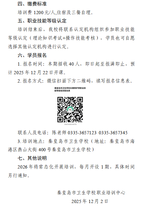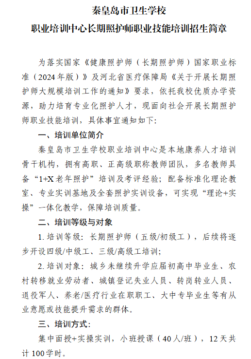 秦皇岛市卫生学校职业培训中心长期照护师职业技能培训招生简章