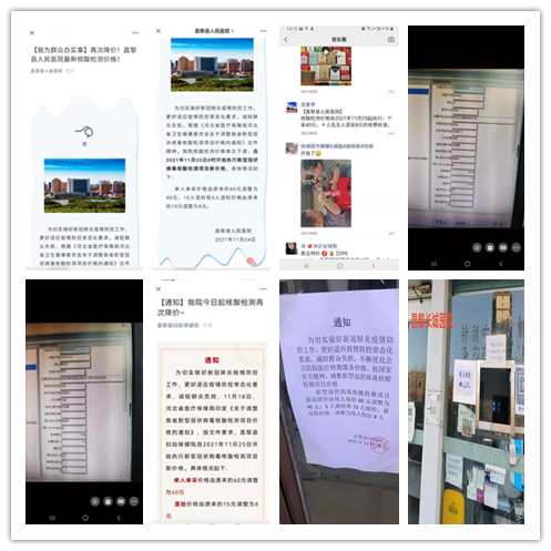 为切实做好新冠肺炎疫情防控工作,更好适应疫情防控常态化要求,减轻群众负担,不断优化公立医疗机构检测服务价格,我县积极贯彻落实市医保局、市卫健委转发的《河北省医疗保障局 河北省卫生健康委员会关于调整我省新型冠状病毒核酸检测项目价格的通知》(秦医保〔2021〕90号)文件精神,再次降低核酸检测项目价格。明确自2021年11月25日起,新型冠状病毒核酸检测项目的最高限价由每人份60元调整为40元;5人混检和10人混检,最高限价由每人份25元、15元统一调整为8元。同时要求,各公立医疗机构要严格落实新型冠状病毒核酸检测收费相关政策,严禁“服务按多人混检进行、收费套用单人单检价格”。昌黎县人民医院、县中医院、妇幼保健院、昌黎长城医院及时对检测价格进行了公示和调整,对医保政策进行了落实落地,为减轻群众负担提供了医疗保障。
