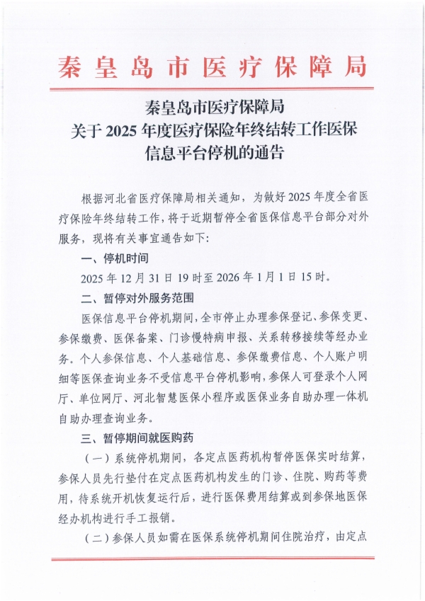 秦皇岛市医疗保障局关于 2025年度医疗保险年终结转工作医保信息平台停机的通告